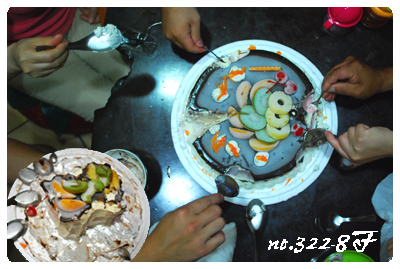 一定要紀錄一下這重要的時刻,真是超爆笑的啦!後來蛋糕被吃成了左下角那樣,很恐怖吧!