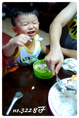 湯圓人小志氣高,也跟著拿了一支湯匙,整個投入挖冰淇淋蛋糕的活動,看他笑得有多開心啊!